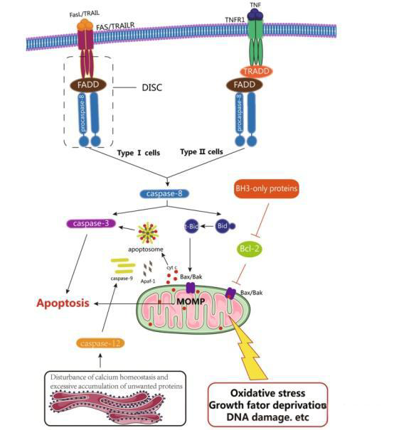 细胞凋亡通常通过两个主要的信号通路来实现:内源性通路(线粒体途径)和外源性通路(死受体途径)。在内源性通路中,细胞内部的线粒体受到损伤或其他刺激后,释放出细胞色素C等蛋白质,进而激活半胱天冬氨酸蛋白酶家族(caspase)并引发细胞凋亡。而在外源性通路中,细胞受到外界因子(如TNF-α)或其他细胞因子的刺激,通过相应的受体激活caspase,从而诱导细胞凋亡。